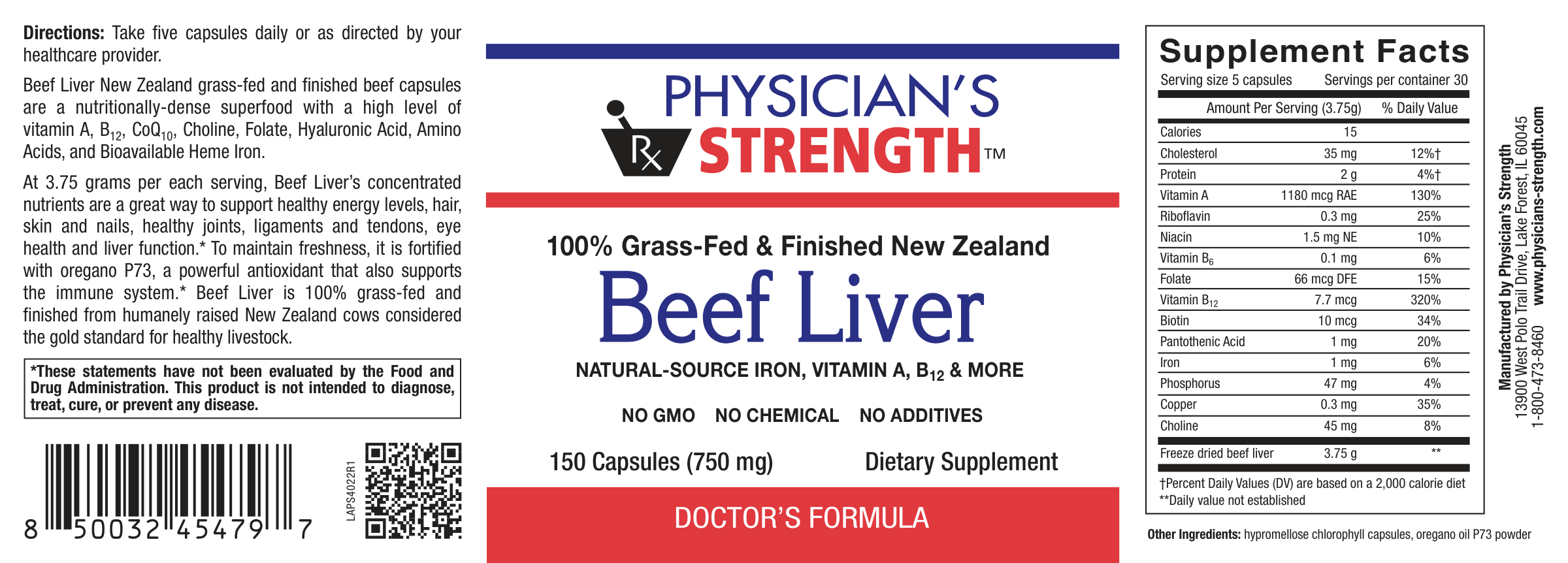 At 3.75 grams per each serving, Beef Liver’s concentrated nutrients are a great way to support healthy energy levels, hair, skin and nails, healthy joints, ligaments and tendons, eye health and liver function.* To maintain freshness, it is fortified with oregano P73, a powerful antioxidant that also supports the immune system.* Beef Liver is 100% grass-fed and finished from humanely raised New Zealand cows considered the gold standard for healthy livestock.