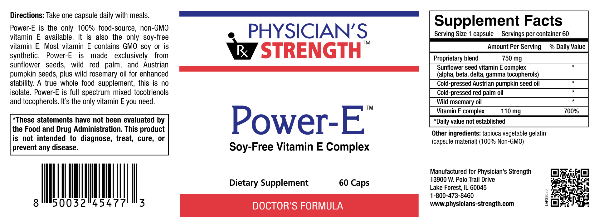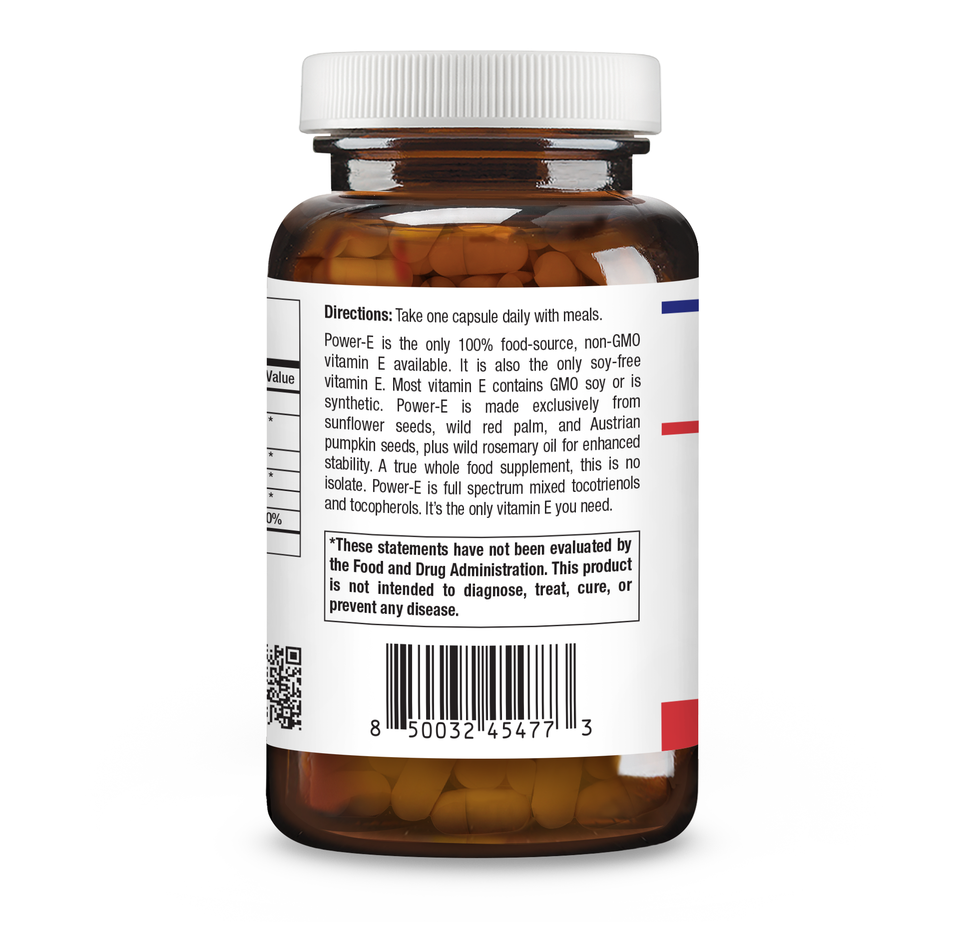 Power-E is the only 100% food-sourced, non-GMO vitamin E available. It is also the only soy-free vitamin E. Most vitamin E contains GMO soy or is synthetic. Power-E is made exclusively from sunflower seeds, wild red palm, and Austrian pumpkin seeds, plus wild rosemary oil for enhanced stability. A true whole food supplement, this is no isolate. Power-E is full spectrum mixed tocotrienols and tocopherols. It’s the only vitamin E you need.